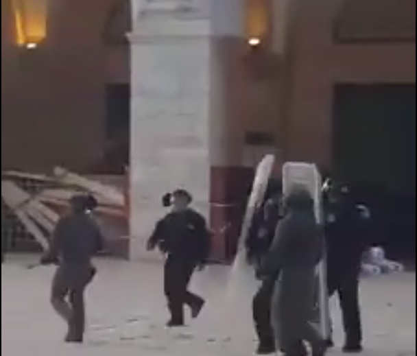 ولفت شهود العيان الى أن قوات الجيش الاسرائيلي الخاصة اعتلت سطح المسجد القبلي، وتقوم برش غاز الفلفل السام من خلال نوافذ المسجد بعد تحطيمها.