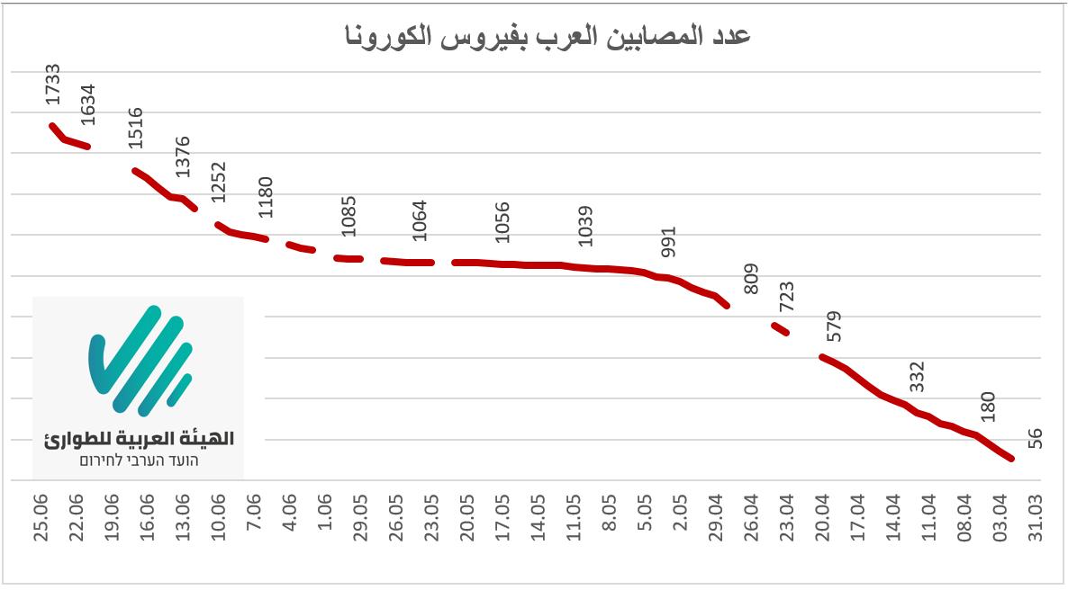 وجاء في بيان صادر عن الهيئة العربية للطوارئ، جاء فيه: "بلغ مجمل عدد المصابين العرب بفيروس الكورونا اليوم الأربعاء 24.06.05 الساعة 10:30 في البلدات العربية، لا يشمل المدن المختلطة، 1733 مع تسجيل 65 اصابة جديدة خلال اليوم الأخير وقد بلغت عدد الإصابات الجديدة المسجلة منذ بداية الأسبوع الحالي 99 إصابة.
