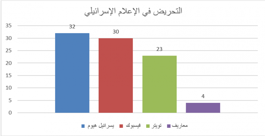 وتشير النتائج إلى المنصة الأكثر تحريضًا على الفلسطينيين، بنسبة 32%، وهي صحيفة "يسرائيل هيوم" المعروفة بمواقفها الصهيونية اليمينية. تليها شبكة التواصل الإجتماعي "فيسبوك" بنسبة 30%، وشبكة "تويتر" بنسبة 23%.