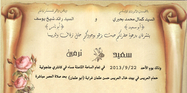 نتشرف بدعوتكم لحضور حفل زفاف سعيد كمال بحيري وذلك يوم الاحد الموافق 22/9/2013 الساعة الثامنة مساء في كانتري جلجولية