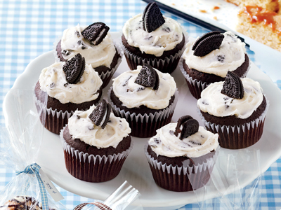 اتركي الكب كيك ليبرد على رف، وحين تبرد كعكات الكب كيك تماما قومي بعمل الكريم بالطريقة المكتوبة على العبوة ثم ضعيه فى كيس الكريما المخصص لتزيين الكيك ثم زيني كل كعكة بالكريمة. قومي بعد ذلك بتقسيم كل بسكويته الى أربعة اجزاء متساوية باستخدام السكين. اغمسي حافة البسكوت المسنن في الكريمة الموجودة على الكب كيك. ضعي الكعكات في طبق تقديم مناسب بعد التزيين، وبالهناء والشفاء.